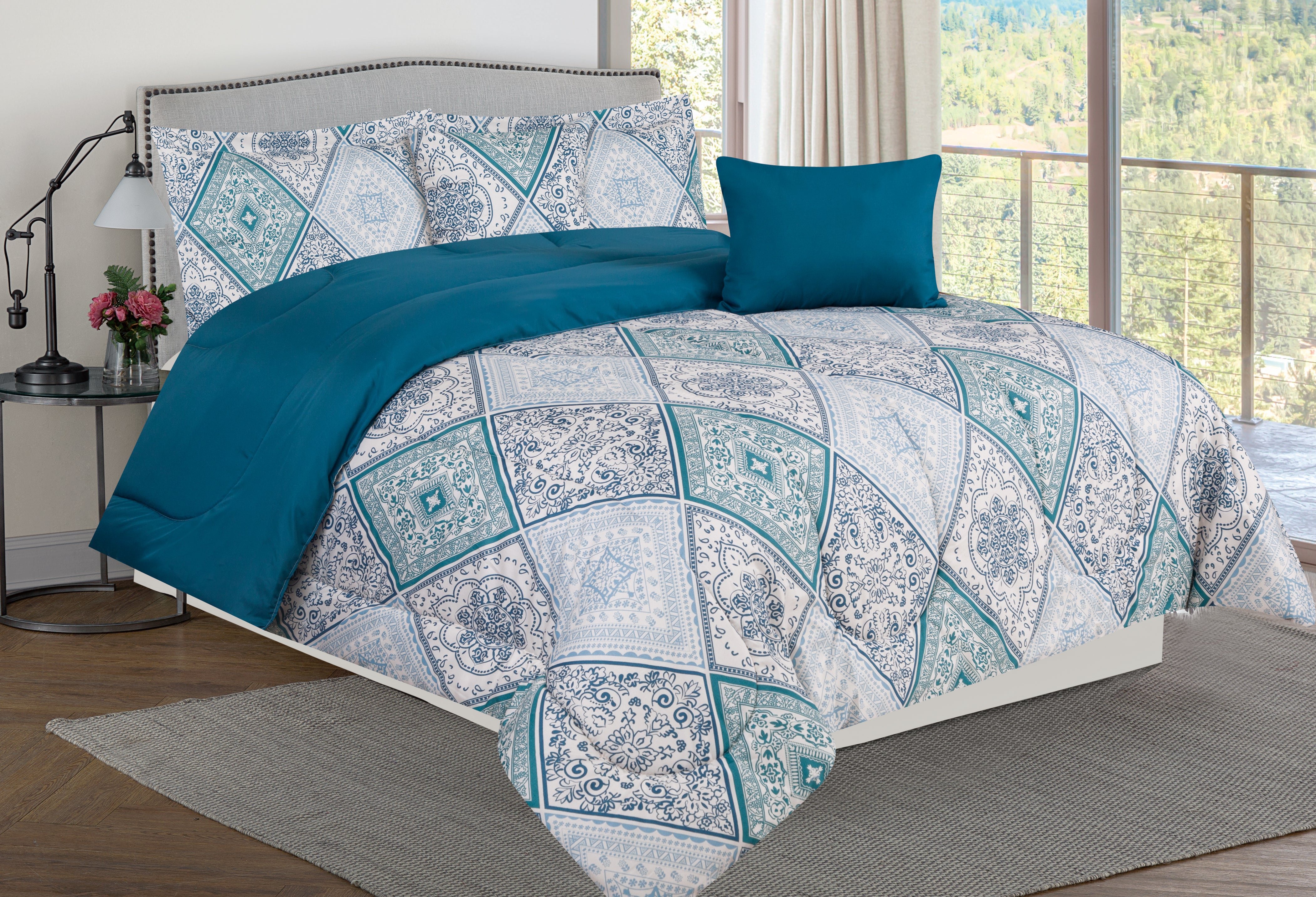 This elegant and chic comforter set will give your bedroom a fashionable makeover! The fresh color palette makes a bold statement. This bedding set is guaranteed to leave an unforgettable impression on all your guests and friends. The super soft microfiber comforter reverses to a coordinating geometric pattern. Available in Queen and King sizes, the set includes a comforter, two standard or King shams, and two complementary decorative pillows to complete the look.