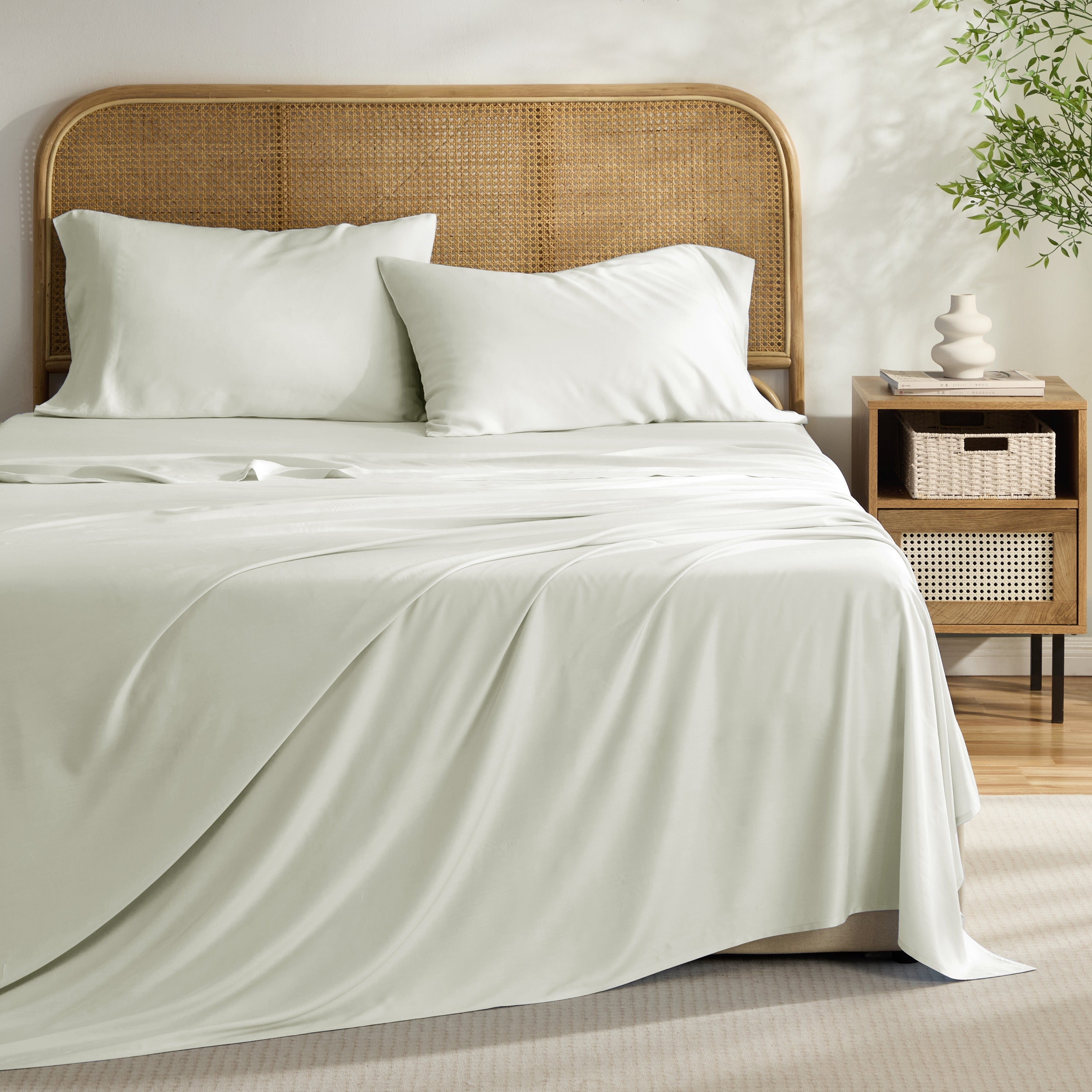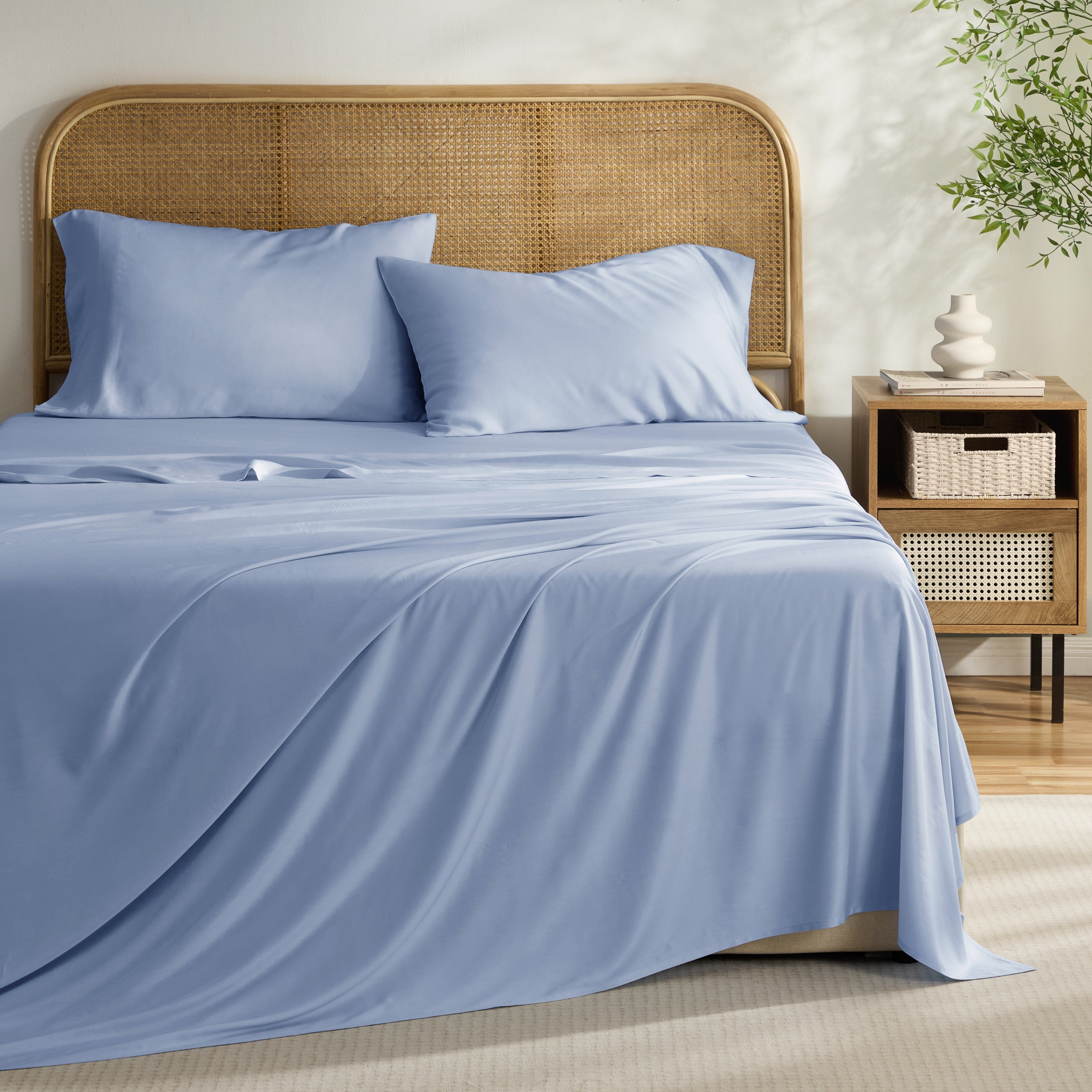 Experience the perfect blend of comfort and elegance with the Kathy Ireland 4-Piece Bamboo Blend Sheet Set. Crafted from a premium bamboo blend, these sheets offer a silky-smooth touch, exceptional breathability, and natural temperature regulation keeping you cool in summer and cozy in winter. Designed for durability and everyday use, this wrinkle-resistant and shrink-resistant sheet set adds effortless style and lasting luxury to your bedroom. The deep pocket fitted sheet ensures a secure fit on mattresses up to 16 inches, while the pillowcases and flat sheet complete the set for a polished look. Perfect for master bedrooms, guest rooms, or gifting, these bamboo blend sheets deliver the comfort you deserve.